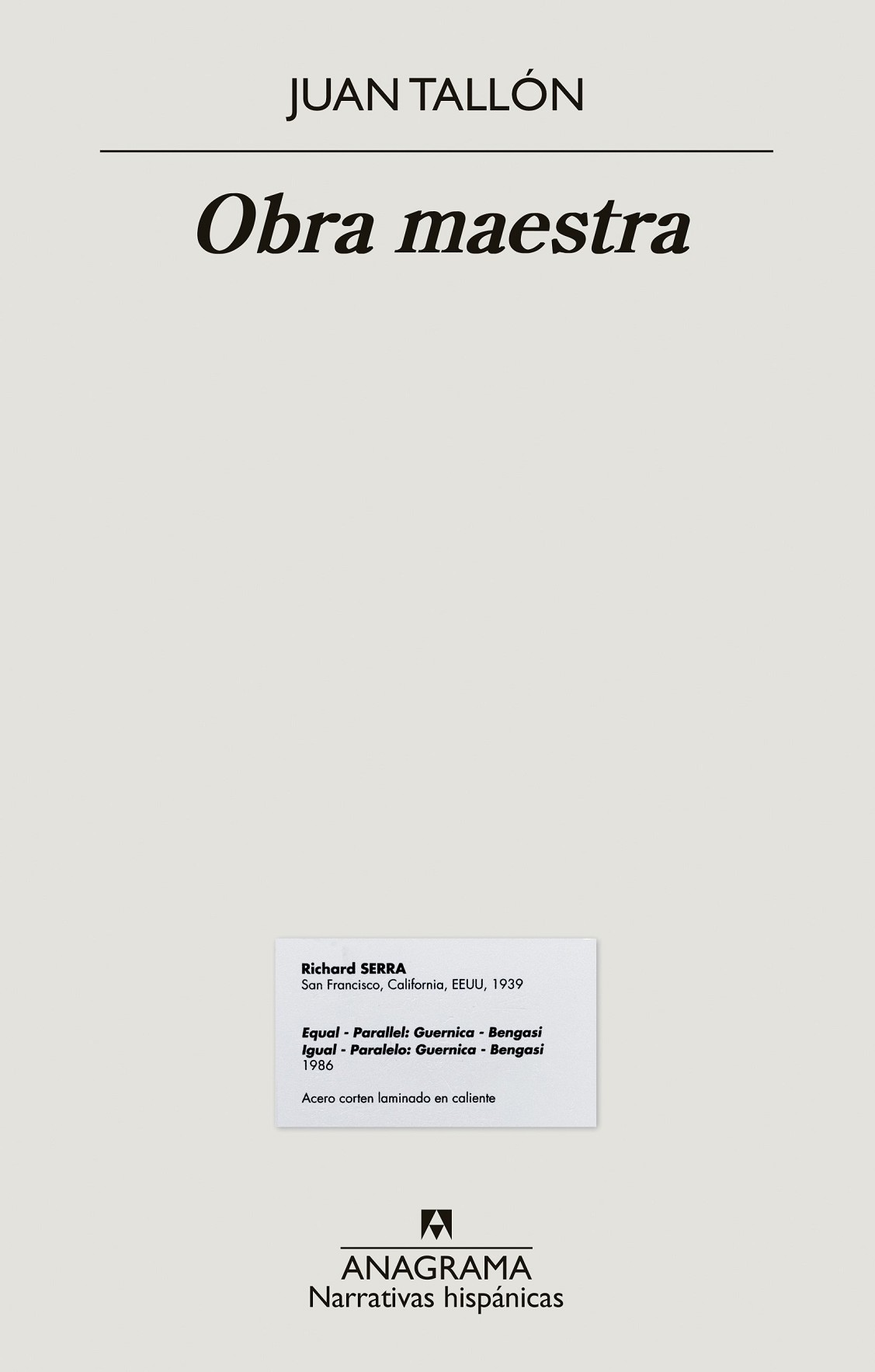 ¿Cómo pudo desaparecer de un almacén del Museo Reina Sofía una enorme escultura de Richard Serra de treinta y ocho toneladas? La historia que narra esta novela es del todo inverosímil... y sin embargo sucedió. Es increíble, pero es verdad: un museo de primer nivel internacional -el Reina Sofía- encarga para su inauguración en 1986 una obra a una estrella de la escultura, el norteamericano Richard Serra. El escultor entrega una pieza creada ad hoc para la sala en la que iba a exhibirse. La escultura en cuestión -Equal-Parallel/Guernica-Bengasi- consta de cuatro bloques de acero independientes de grandes dimensiones. Inmediatamente se eleva la pieza a obra maestra del minimalismo. Finalizada la muestra, el museo decide guardarla, y en 1990, por falta de espacio, la confía a una empresa de almacenaje de arte, que la traslada a su nave en Arganda del Rey. Cuando quince años después el Reina Sofía quiere recuperarla, resulta que la escultura -¡de treinta y ocho toneladas!- se ha volatilizado. Nadie sabe cómo ha desaparecido, ni en qué momento, ni a manos de quién. Para entonces la empresa que la custodiaba ya ni siquiera existe. Cero pistas sobre su paradero.La misteriosa desaparición queda elevada también a categoría de obra maestra. Como el escándalo adquiere resonancia mundial, Serra acepta replicar la pieza y darle rango de original, y el Reina Sofía, sumarla a su exposición permanente. Entre la novela de no ficción y la crónica novelada, entre el disparate y lo alucinógeno, Obra maestra reconstruye a ritmo de thriller trepidante un caso que lleva a hacerse algunas preguntas perturbadoras: ¿cómo es posible que algo así sucediera? ¿Cómo se convierte en original una copia? ¿Qué es arte en el arte contemporáneo? ¿Cuál fue el verdadero destino de la famosa, enorme y pesada escultura de acero convertida en aire? ¿Es posible que un día aparezca?Para responder a estas y otras preguntas, las páginas de la novela acogen una sucesión de voces muy dispares: las de la fundadora del Reina Sofía, algunos de sus directores, los policías de la Brigada de Patrimonio que investigaron la desaparición, la jueza que instruyó el caso, personal del museo, ministros, el empresario que custodió la obra, galeristas americanos, el propio Richard Serra, su amigo -y antiguo ayudante- Philip Glass, marchantes de arte, críticos, artistas, concejales, coleccionistas, un coreógrafo que danzó alrededor de la escultura, ingenieros, periodistas, historiadores, vigilantes, políticos, una terrorista, un jubilado, un camionero, un chatarrero, un taxista, una agente de la Interpol, el propio autor del libro, en tratos con una editora para escribirlo, o César Aira, que propone una teoría tan loca como deliciosa sobre el verdadero destino de la escultura.